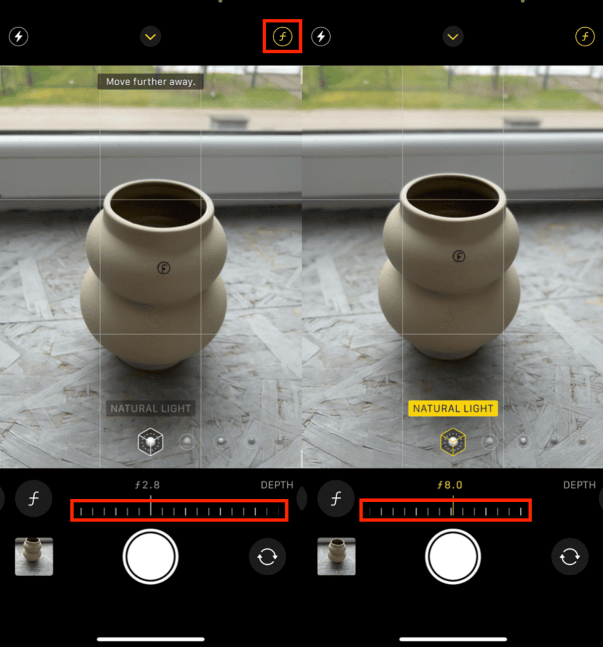 - 在右上角,您將看到 f-stop 按鈕(f 後跟數字)。點擊它可打開景深滑塊。