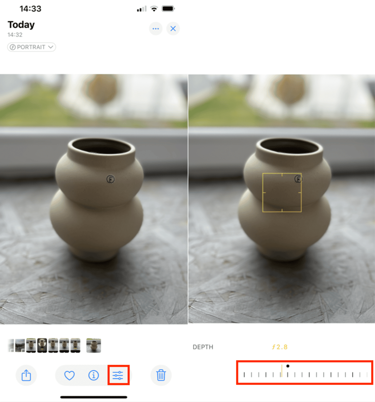- 深度控制滑塊將與編輯屏幕上的照片一起打開。