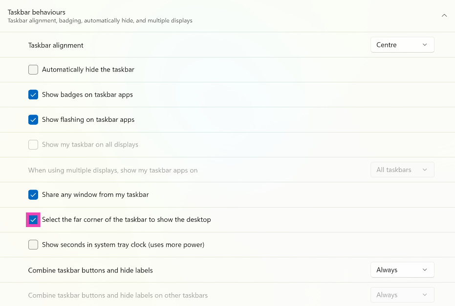 右鍵單擊任務欄,選擇“任務欄設置”,轉到“任務欄行為”,然後單擊“選擇任務欄的遠角以顯示桌面”複選框。