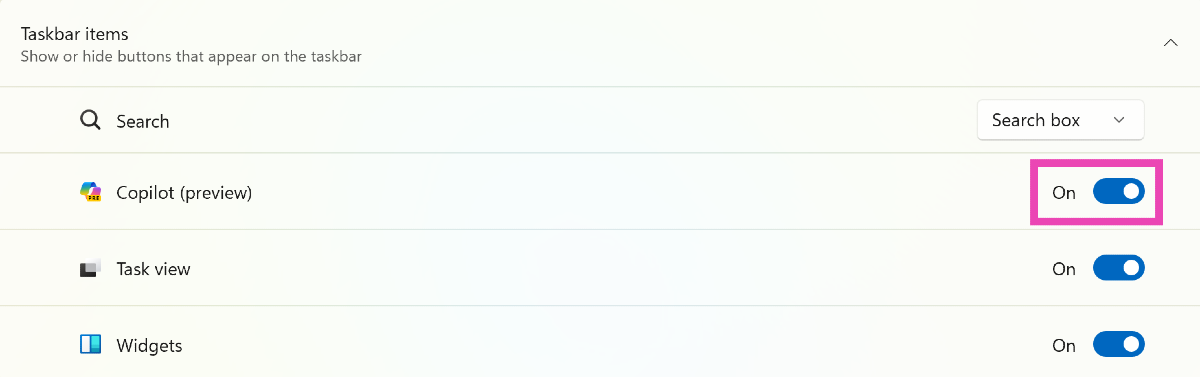 要從任務欄刪除 Copilot,請右鍵單擊任務欄,選擇“任務欄設置”,轉到“任務欄項目”,然後關閉 Copilot 的切換開關。