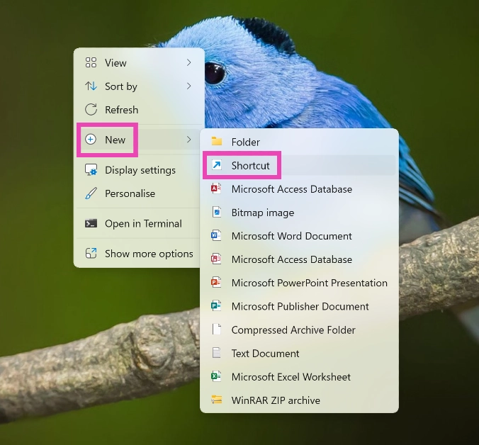 步驟一: 右鍵單擊在桌面上並轉至新>快捷方式。