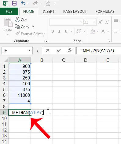 第 3 步:輸入=中位數(AA:BB)進入細胞,其中AA是范圍中第一個單元格的單元格位置,並且BB是最後一個單元格的單元格位置。