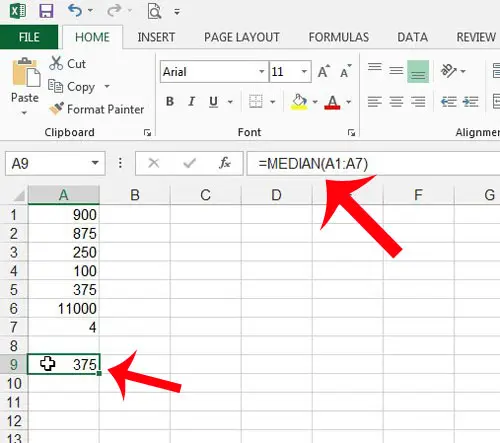 請注意,中位數將顯示在單元格中,但您仍然可以通過單擊單元格然後查看公式來查看公式方程式吧位於電子表格上方。