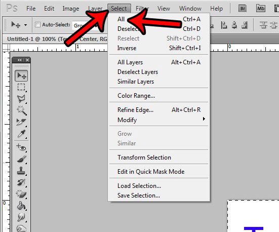 - 按Ctrl + A在鍵盤上選擇整個圖層。您還可以通過單擊來執行此操作選擇窗口頂部,然後單擊全部。
