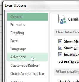 第 4 步:單擊先進的左側的選項卡Excel 選項窗戶。