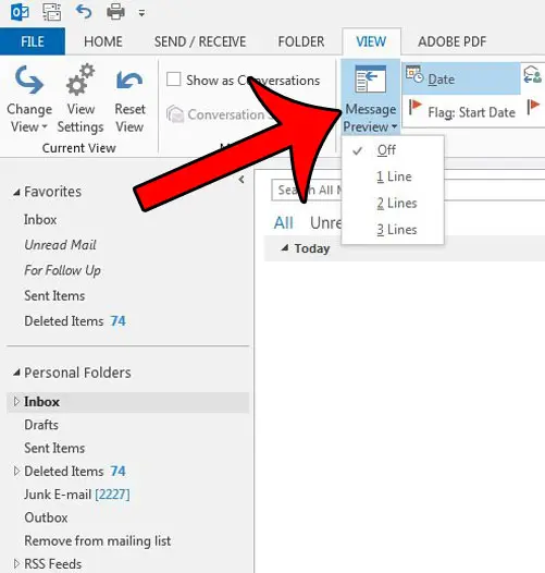 如果您更喜歡此顯示選項,那麼我們的教程將向您展示如何更改 Outlook 2013 郵件中的預覽行數,以便您一次看到更多郵件。