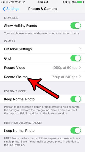 我們的指南在下文中繼續提供有關如何更改 iPhone 7 上的慢動作錄製設置的更多信息,包括這些步驟的圖片。