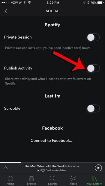 第五步:點擊右側的按鈕發布活動將其關閉。當按鈕周圍沒有綠色陰影時,您就會知道該設置已關閉。下圖中的 iPhone 未與關注者分享 Spotify 活動。
