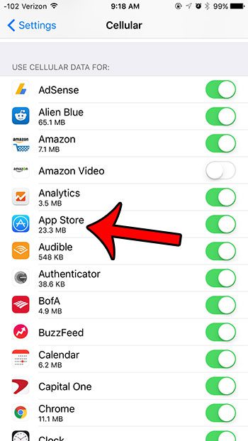第 3 步:向下滾動並找到一個應用程序。下面顯示的數字表示該應用程序的數據使用情況。例如,應用商店下圖中已使用 23.3 MB。