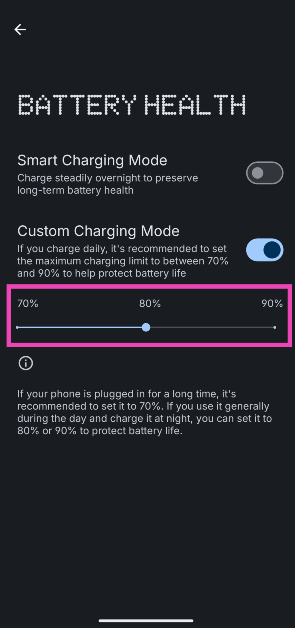前往設置>電池>電池健康狀況然後打開自定義充電模式旁邊的切換開關。使用滑塊將充電限制設置為 80%。