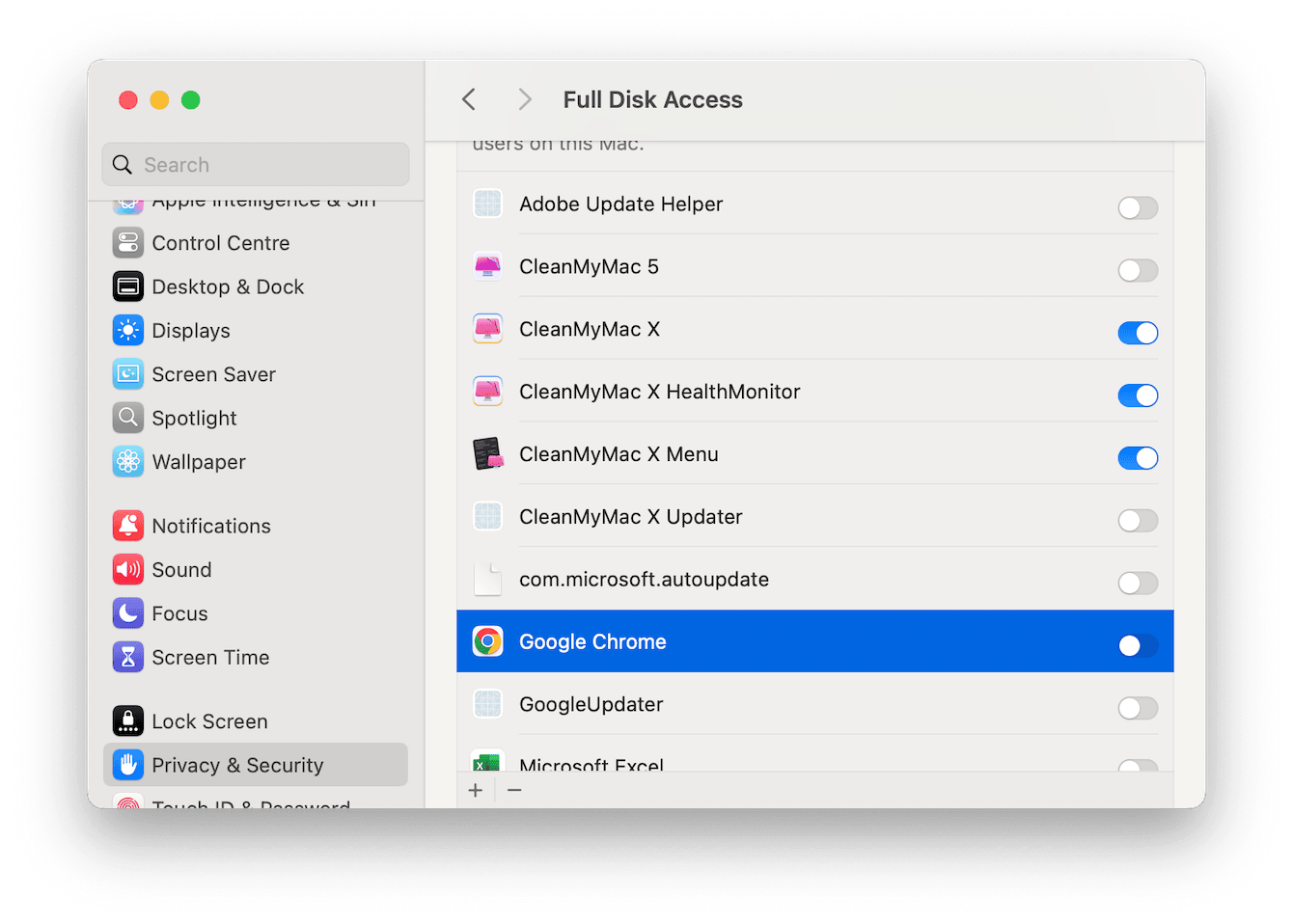 檢查 Google Chrome 是否在列表中。如果它被關閉,則該開關會重新打開。