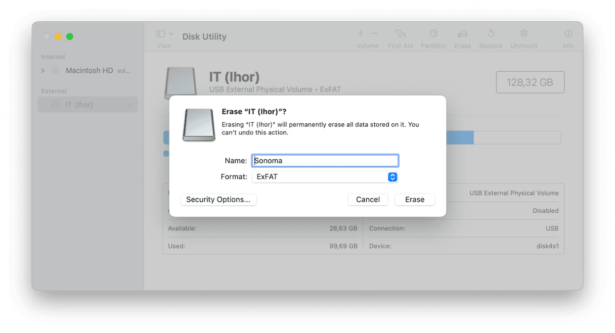 - 選擇 APFS 作為格式並將捲命名為“Sonoma”。單擊“擦除”。
