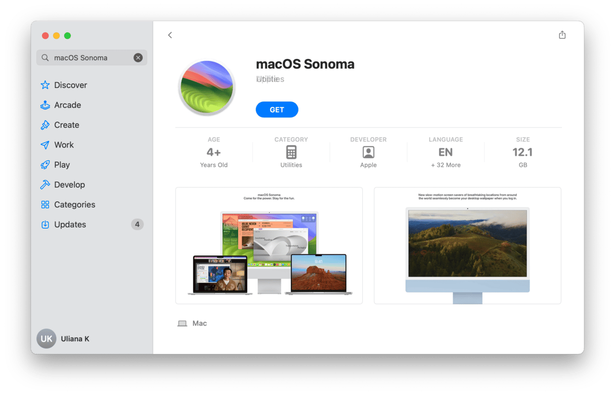 - 打開 Mac App Store 應用並蒐索“macOS Sonoma”。單擊“獲取”進行下載。