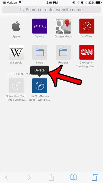步驟 4:點擊並按住您要從列表中刪除的網站的圖標經常訪問直到圖標展開,然後放開它並點擊刪除按鈕。