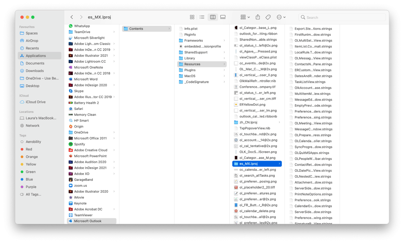 .lproj 文件開頭的兩個字母將指示語言;在這裡的示例中,您可以看到 es.那是西班牙語,我們希望我們能說西班牙語,但我們不能,所以我們知道我們可以安全地刪除它。