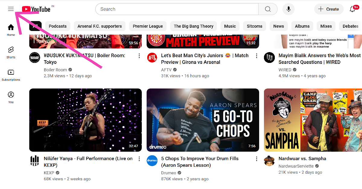 步驟一:前往 YouTube 並點擊漢堡菜單在屏幕的左上角。