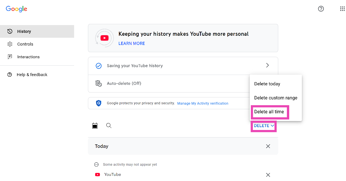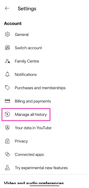 啟動 YouTube 應用程序,轉至您>設置>管理所有歷史記錄>刪除並選擇“刪除所有時間”。
