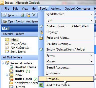 您將在 Outlook 2003 中使用的最重要的菜單之一稱為“選項”菜單,您可以通過單擊屏幕頂部的“工具”找到該菜單。從此菜單中,您可以更改程序中的許多設置,包括將消息撰寫格式從 HTML 或富文本切換為純文本。