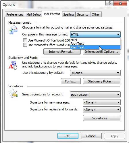 - 單擊按照此消息格式撰寫下拉並選擇純文本。