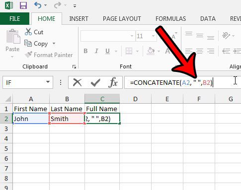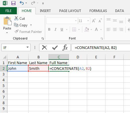 您可能會注意到,Excel 將準確合併這些單元格中的內容。在上面的示例中,該公式將得出 JohnSmith。不幸的是,這不是期望的結果,所以我需要對公式進行調整。如果我將公式更改為=CONCATENATE(A2, " ", B2)然後它將顯示所需的“John Smith”結果。請注意,該公式中的引號之間有一個空格。