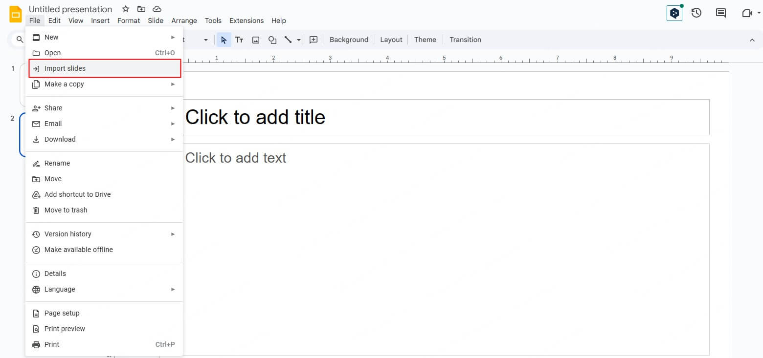 步驟一:啟動 Google 幻燈片並選擇“文件 > 導入幻燈片”。