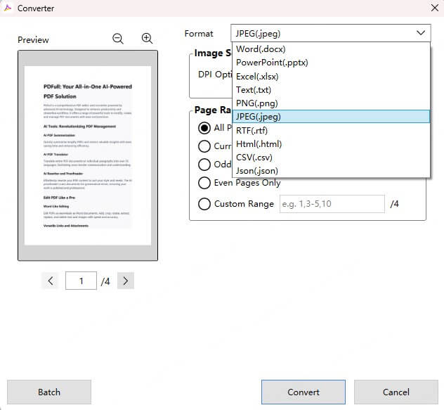 步驟 3 – 選擇 JPG 格式:在轉換對話框中,選擇JPG/JPEG作為輸出格式。您還可以調整分辨率、質量和頁面範圍等設置。