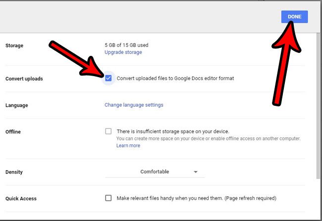 第 3 步:選中左側的框將上傳的文件轉換為 Google 文檔編輯器格式,然後單擊藍色完畢該窗口右上角的按鈕。
