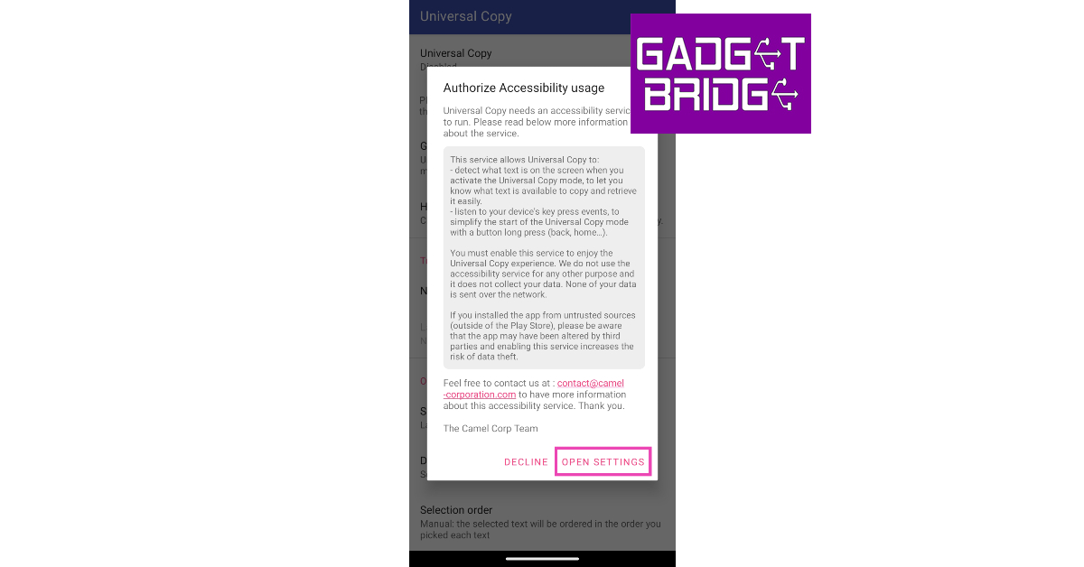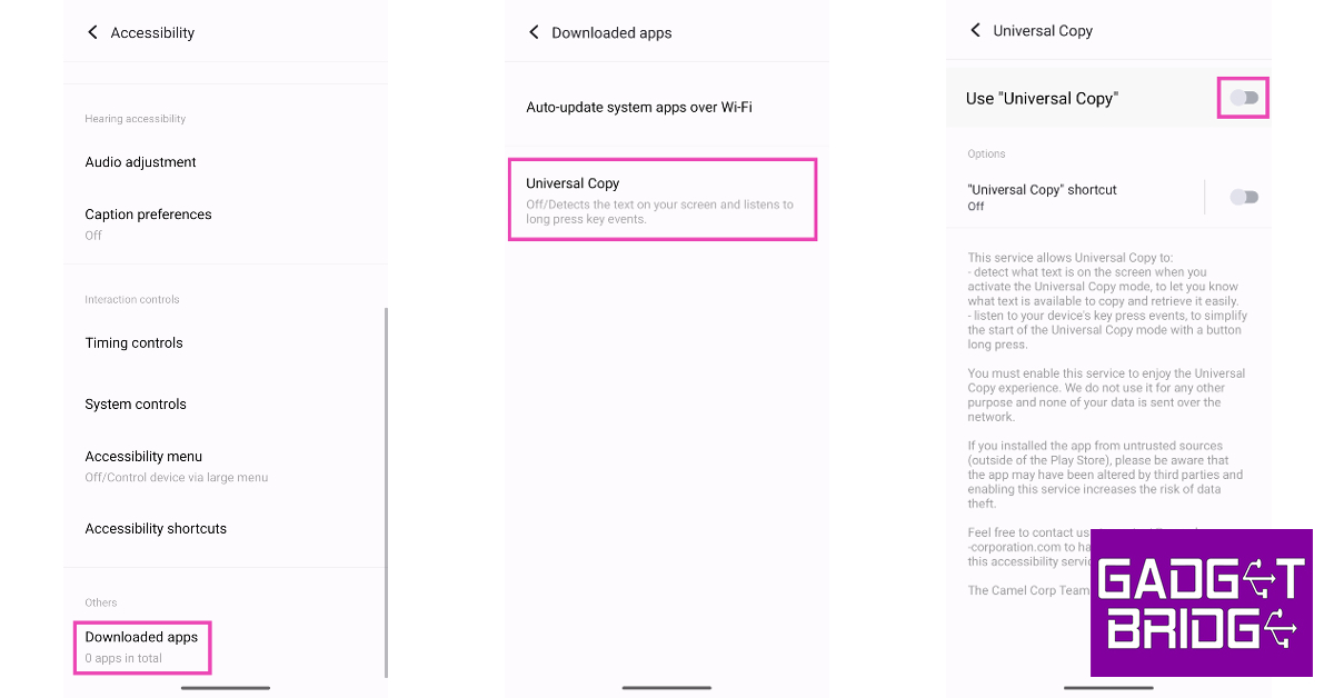 第5步:您將被重定向到輔助功能設置您需要授予通用複制權限閱讀文字在屏幕上。前往下載的應用程序並打開撥動開關通用副本。