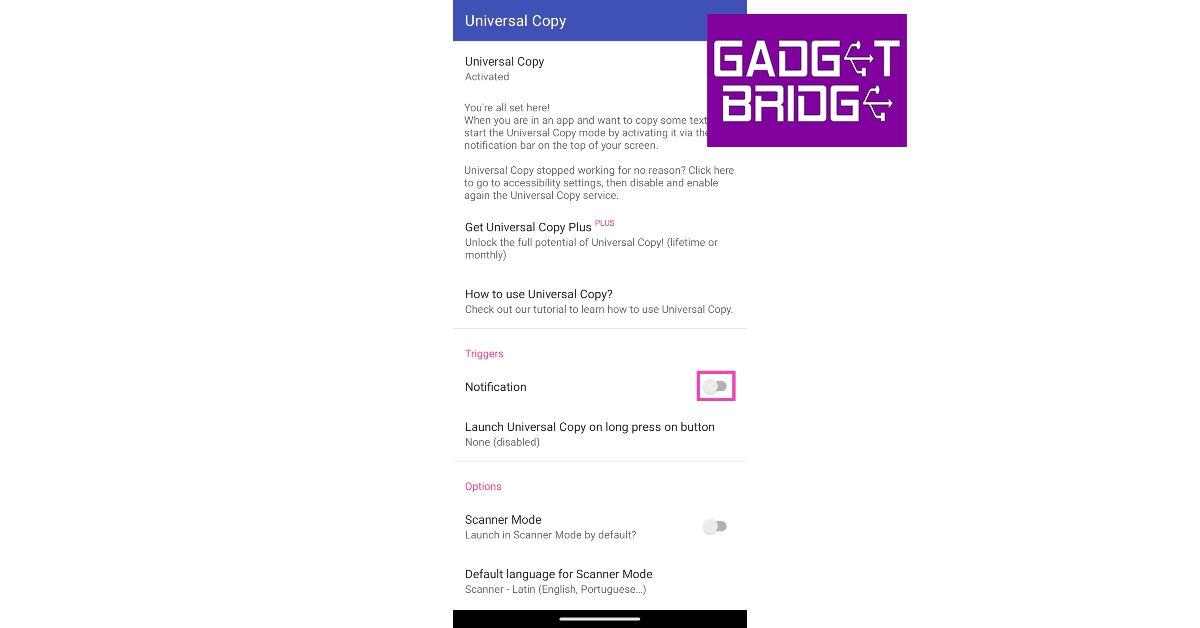 在設備上安裝 Universal Copy 後,請轉到輔助功能設置並授予 Universal Copy 讀取屏幕上文本的權限。然後,也允許它訪問通知。應用程序啟動並運行後,只需從通知面板中選擇正常模式,然後選擇要復制的文本即可。