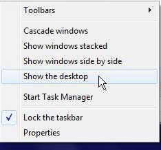 通過顯示桌面繼續創建 Windows 7 桌面文件夾。您可以通過右鍵單擊屏幕底部的任務欄,然後單擊顯示桌面。