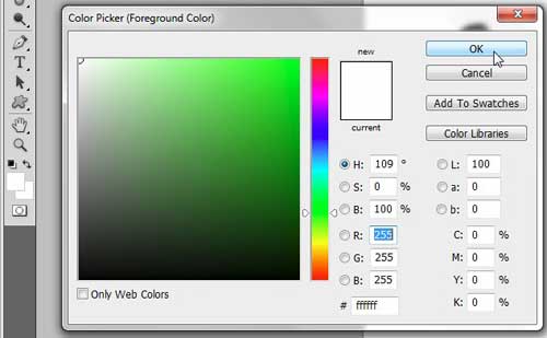 第 4 步:單擊前景色在窗口左側工具箱中的框中,單擊顏色選擇器左上角選擇白色,然後單擊好的按鈕。