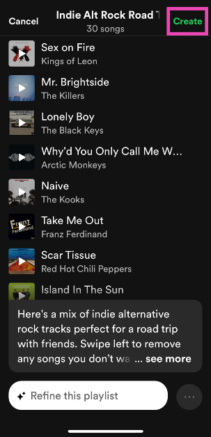 第5步:Spotify 將製作播放列表根據提示。你可以編輯此播放列表中的歌曲或通過輸入進一步細化它後續提示。