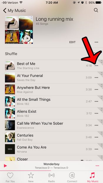 步驟 3:找到您要刪除的已下載歌曲,然後點擊帶有三個水平點的圖標。請注意,歌曲列表的右側有一個小電話圖標,表明它已下載到您的 iPhone。