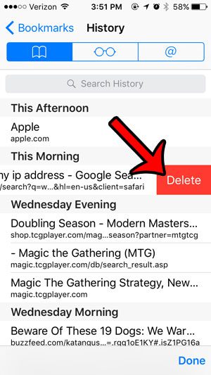 步驟 4:在要刪除的歷史記錄頁面上向左滑動,然後點擊紅色刪除按鈕。