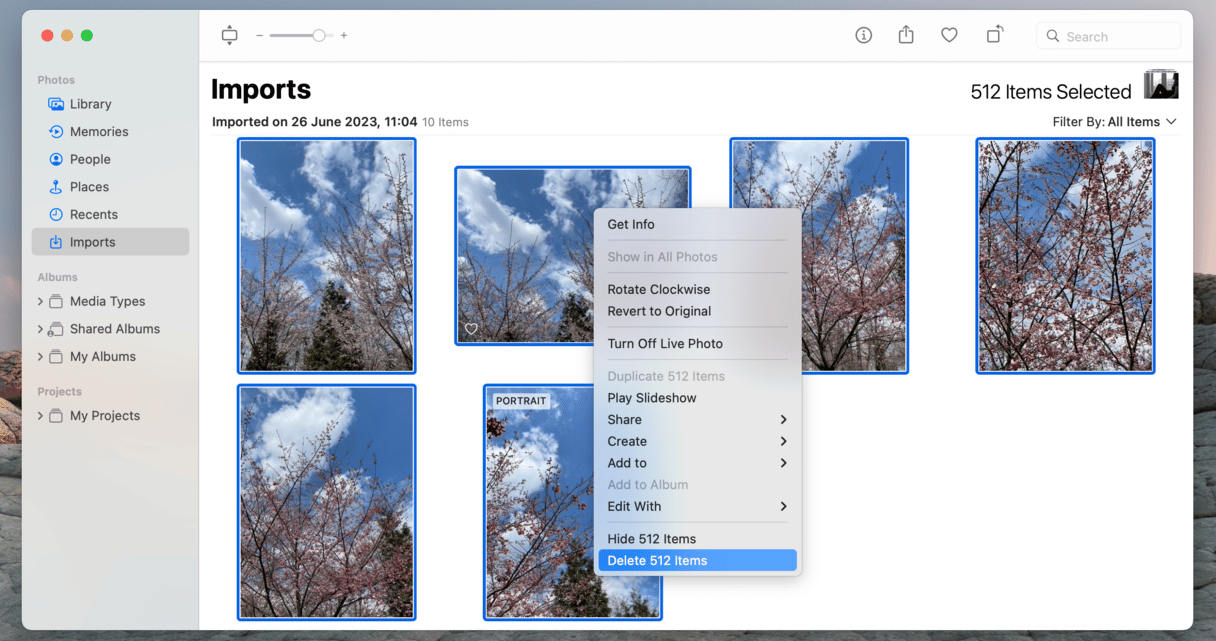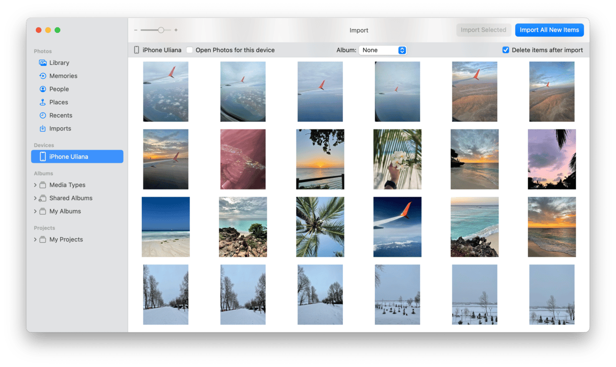 如果您剛剛將照片從 iPhone 導入到 Mac,則可以刪除它們。您所要做的就是選擇要導入的照片,然後在 Mac 上的“照片”應用程序中選擇“導入後刪除項目”。
