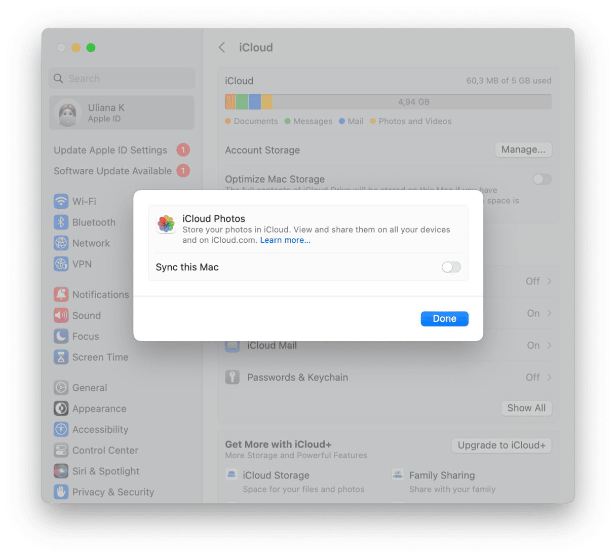 - 禁用 iCloud 照片:在 iPhone 上,前往“設置”>“[Apple ID]”>“iCloud”,然後關閉“照片”。您也可以在 Mac 上執行此操作:導航至“系統設置”>“[Apple ID]”>“iCloud”>“照片”。
