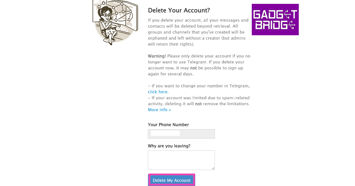 要立即刪除您的 Telegram 帳戶,請轉到 Telegram 網站上的帳戶刪除頁面,輸入您的電話號碼,然後輸入 Telegram 應用程序上發送給您的確認碼。