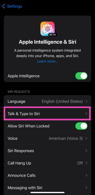 您可以通過以下方式關閉 iPhone 上的 Apple Intelligence:設置>Apple Intelligence 和 Siri並關閉屏幕頂部的切換開關。