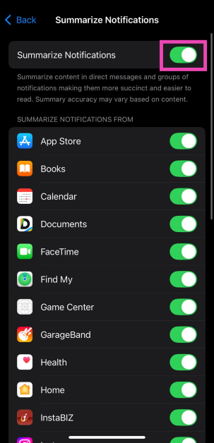 步驟3:關閉旁邊的切換開關總結預覽完全禁用該功能。如果您不想這樣做,請向下滾動並關閉切換開關您不希望收到匯總通知的應用程序。