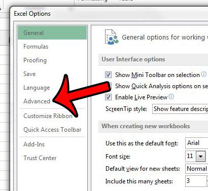 第 4 步:單擊先進的左側的選項卡Excel 選項窗戶。