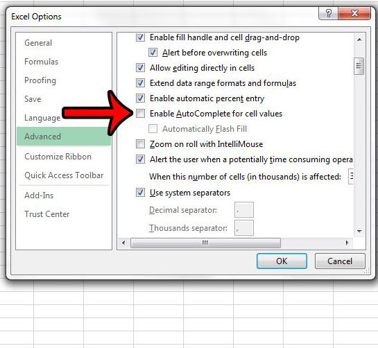 第五步:點擊左邊的方框為單元格值啟用自動完成刪除複選標記。然後您可以單擊好的窗口底部的按鈕以應用更改並關閉窗口。