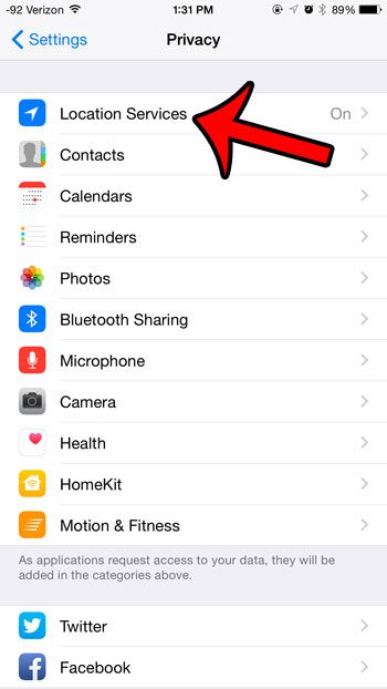 第 3 步:點擊定位服務按鈕。如果您選擇瀏覽 iCloud 菜單,則需要滾動到菜單底部並選擇分享我的位置選項(您也可以跳過步驟 4)。