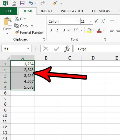 步驟 2:選擇包含帶逗號的數字的單元格。您可以通過單擊電子表格側面的行號來選擇整行,也可以通過單擊電子表格頂部的列字母來選擇整列。您還可以通過單擊 A 行標題和第 1 列標題之間的灰色單元格來選擇整個電子表格。