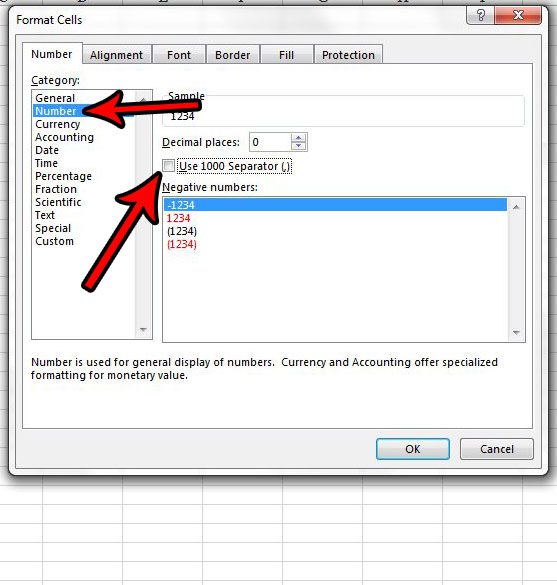 第 4 步:選擇數字選項中的類別窗口左側的列,然後單擊左側的框使用 1000 分隔符從框中刪除複選標記。然後您可以單擊好的按鈕位於窗口底部。