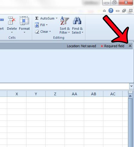 本文中的步驟將引導您完成 Excel 2010 菜單,以便您可以在工作表上方顯示文檔面板。當我們使用短語“文檔面板”時,它指的是下圖中紅色框出的對象。