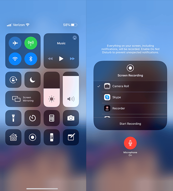 如果您遵循上述步驟,您可能會注意到的是您的屏幕錄製沒有任何聲音。實際上,您可以記錄屏幕並從麥克風中拾取音頻。假設您已經添加了“屏幕錄製”按鈕到控制中心: