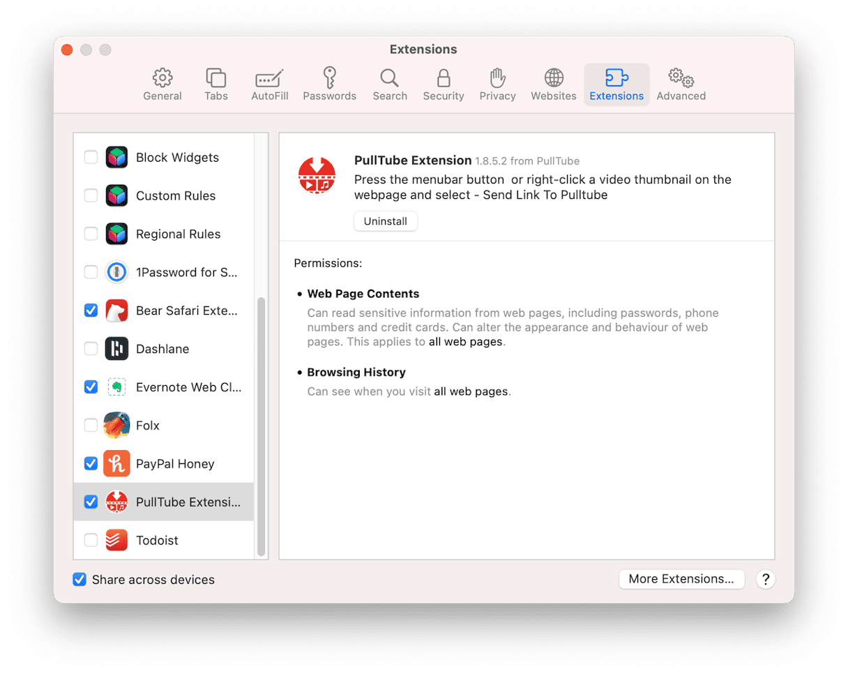 上述方法均不允許您在 Safari 中下載 YouTube 視頻或從大多數其他免費流媒體服務下載視頻。為此,您將需要一個額外的工具。大多數這些工具都是瀏覽器擴展,它們在瀏覽器的菜單欄中放置了一個按鈕。有些(例如 PullTube)還有一個單獨的應用程序,位於您的“應用程序”文件夾中。安裝擴展程序或應用程序後,您只需導航到視頻所在的頁面並單擊瀏覽器工具欄中的按鈕即可。並非所有擴展程序都適用於每個流媒體網站,因此需要反複試驗才能找到適合您要下載的視頻的擴展程序。