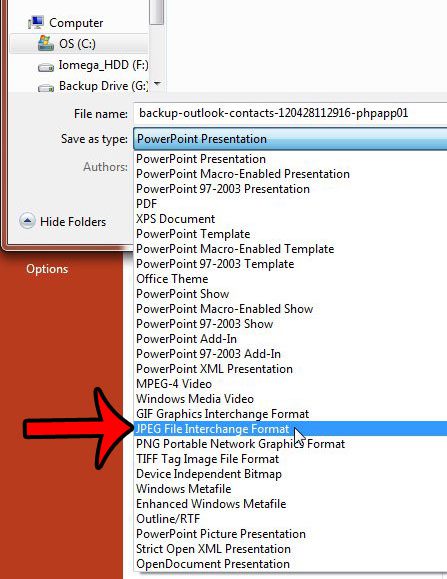 第六步:點擊右側的下拉菜單另存為類型,然後選擇JPEG 文件交換格式選項。此時您還可以更改幻燈片的名稱。單擊節省完成後按鈕。