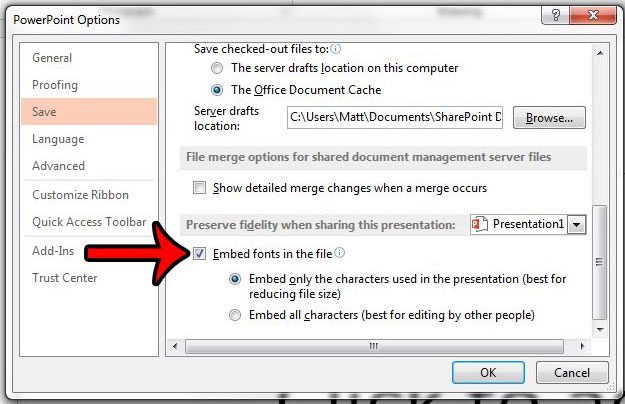 步驟 5:滾動到此菜單的底部,然後選中左側的框在文件中嵌入字體。如果查看該文件的其他人將對其進行編輯,那麼最好也選擇嵌入所有字符本節中的選項。然後您可以單擊好的按鈕位於底部幻燈片選項窗口以將其關閉並應用您的更改。
