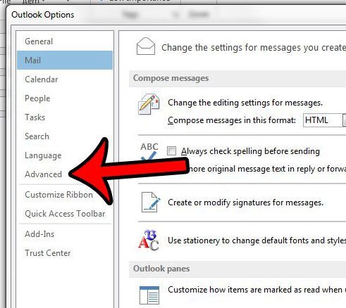 第 4 步:單擊先進的Outlook 選項窗口左欄中的選項卡。